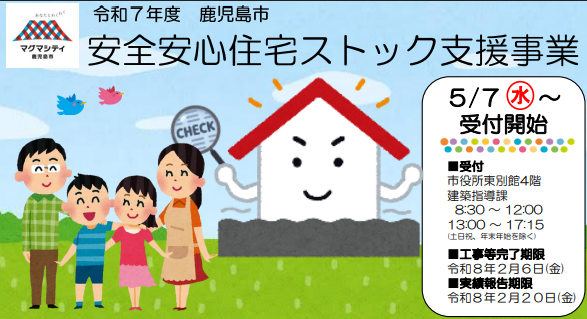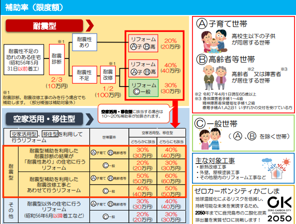 鹿児島市では、既存住宅の安全性を確保し、良質な住宅ストックの形成を図るとともに、子育て、高齢者等世帯の安心な住まいづくりを促進するため、住宅の耐震診断、耐震改修工事及びリフォームに要する費用の一部を補助してくれる仕組みがございます。